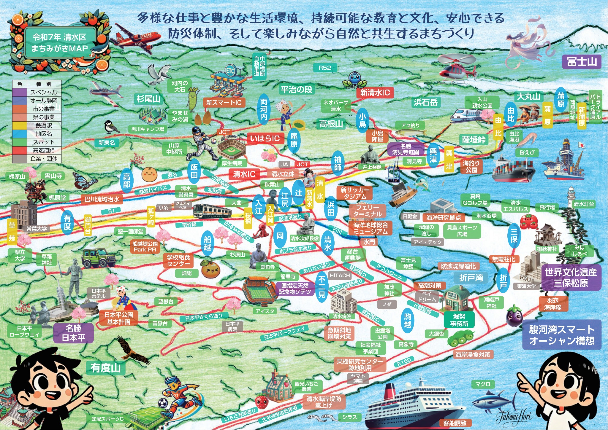 リーフレットには、清水区内の265㎢を俯瞰した自作の鳥瞰図を掲載しました。全体像を把握し、地域の特性を活かしたバランスの取れた政策を、皆さんと共に進めていきます。「全ての声を大切に、皆さんと共に明日を描く」という思いを胸に、「多様な仕事と豊かな生活環境、持続可能な教育と文化、安心できる防災体制、そして自然と共生しながら楽しめるまちづくり」を目指して、若者世代とシニア世代に配慮した政策 を進めていきます。