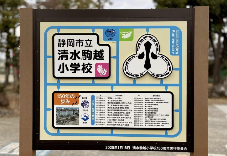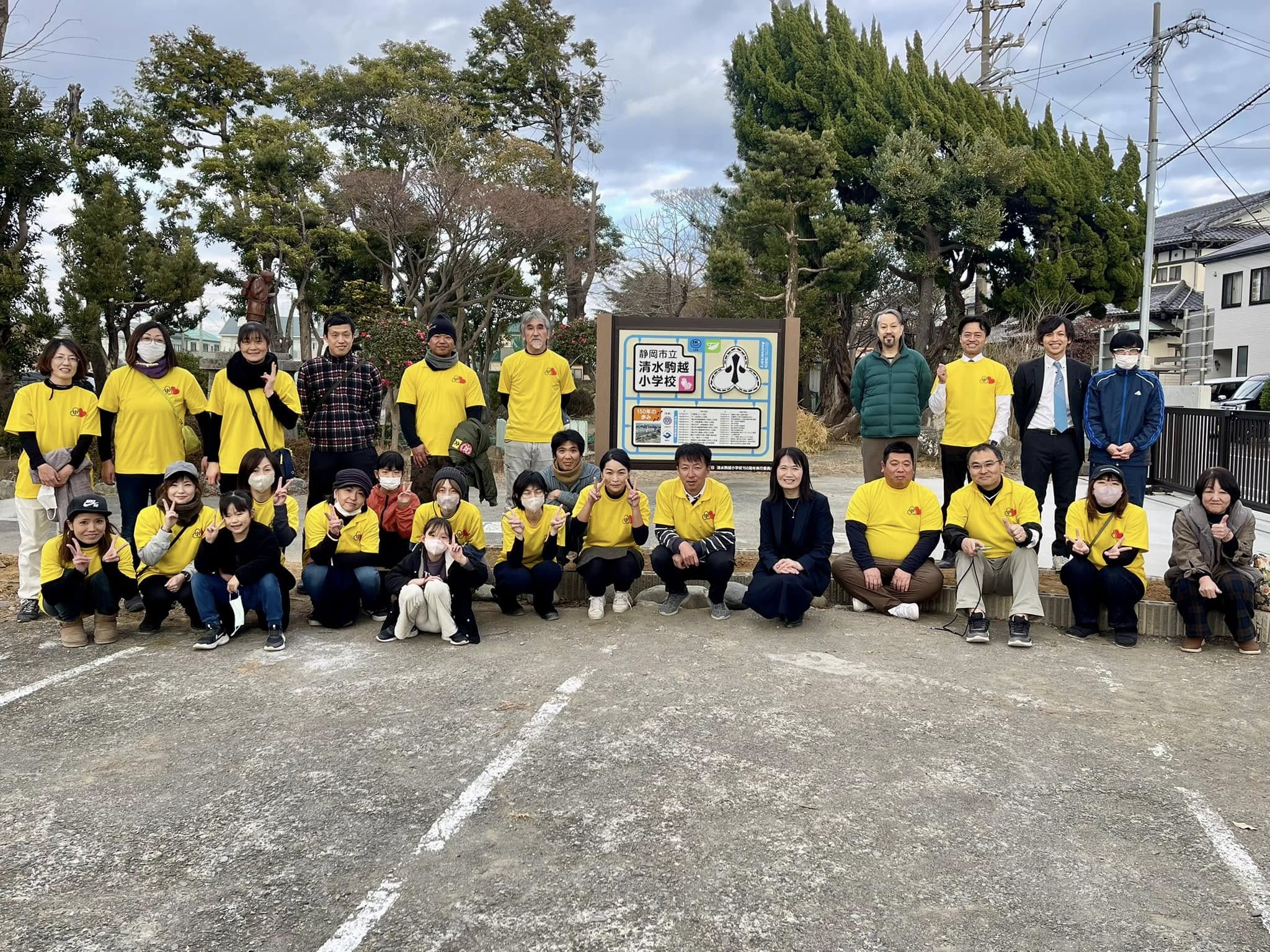 1月18日には記念式典で除幕式を行い、立候補した児童4人と「シズラ」も参加しました。看板は、二宮金次郎像や富士山、100周年記念モニュメントを背景に撮影できるデザインとなっており、これから多くの方々の思い出の場所として活用されることを期待しています。