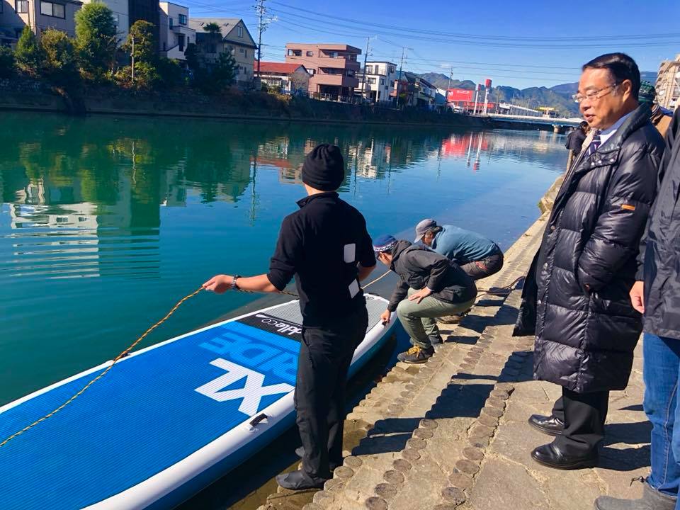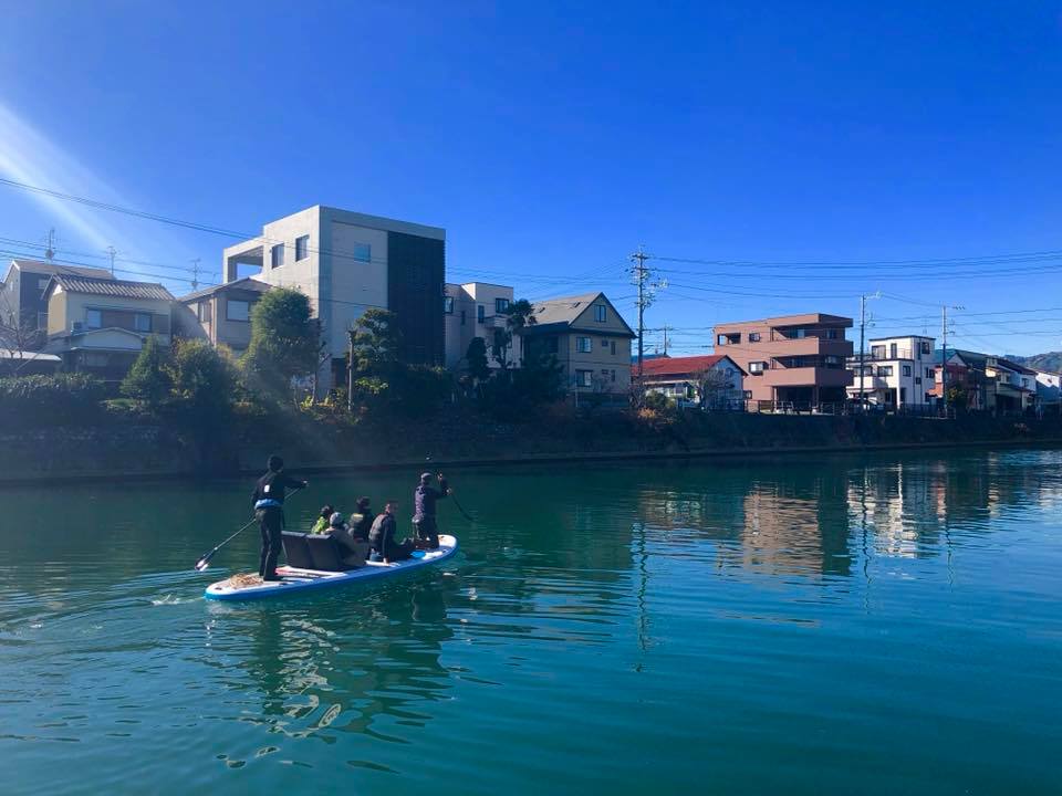 ▶今回は江尻地区の巴川ほとりにて、「メガSUP」(スタンドアップパドルボード)の体験試乗と「巴川バーガー」の試食会が行われました。今回は横浜からお越しのインストラクターの方にパドルを漕いでもらいSUPを10分間ほど体験試乗しましたが、大変乗り心地がよく安定していて、波が無い巴川にぴったりのアクティビティでした。また、「巴川バーガー」は9月に開催された「リノベーションまちづくり@しみず」にて提案された、巴川界隈の賑わいを取り戻すための新名物となる為の試作品でしたが、ワサビのタルタルソースがとてもおいしくてそのまま商品化出来るクオリティでした。