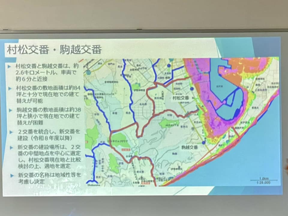 静岡県では年間平均5.6棟の交番が建て替えられています。最近、警察から、不二見地区と駒越地区をカバーする村松交番と駒越交番を統合し、新しい場所に移転する計画が発表されました。この移転と建て替えは令和8年度から段階的に行われる予定ですが、移転先はまだ決まっていません。適切な土地が見つからない場合、村松交番の現地で建て替える可能性もあります。私は、清水病院通り沿いが適切な場所だと警察に提案しました。
