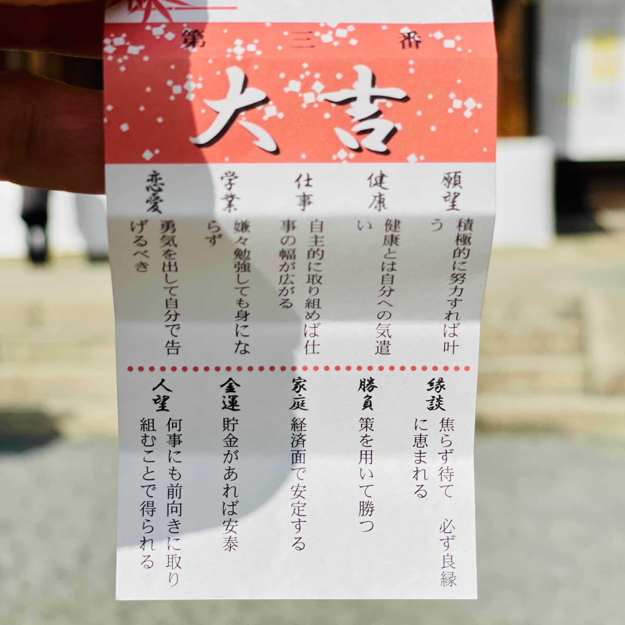 2022.01.9活動記録静岡県護国神社の初詣祭 静岡県護国神社の初詣祭で「大吉」を引きました。昨年の後厄はなんとか乗りきりました。今年は寅年にちなみ、ピンチをチャンスとトラえ、色々トラいする、コロナ禍をコロナ果とする1年にしたいと思います。 活動記録静岡商工会議所 賀詞交換会前の記事不二見まつり次の記事